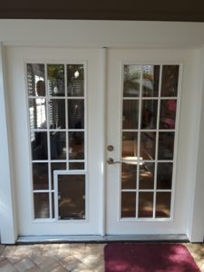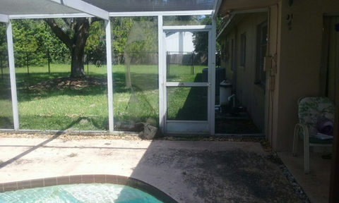 Lanai Screen - Pool Enclosures - A doggie door or cat door can be placed in a pool enclosure either in a screen panel section or possibly in the screen door / storm door itself. Can be ordered in white, bronze, tan or aluminum color to coordinate with your lanai. A security cover can also be ordered to control your pets’ access to the outside. Call to discuss.